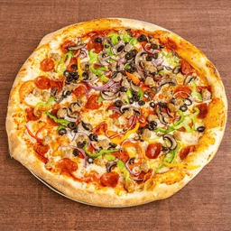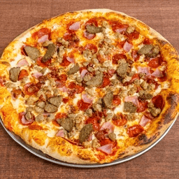 Pizza Sauce, Mozzarella Cheese, Pepperoni, Italian Sausage, Canadian Bacon, Black Olives, Mushrooms, Bell Peppers and Red Onions.